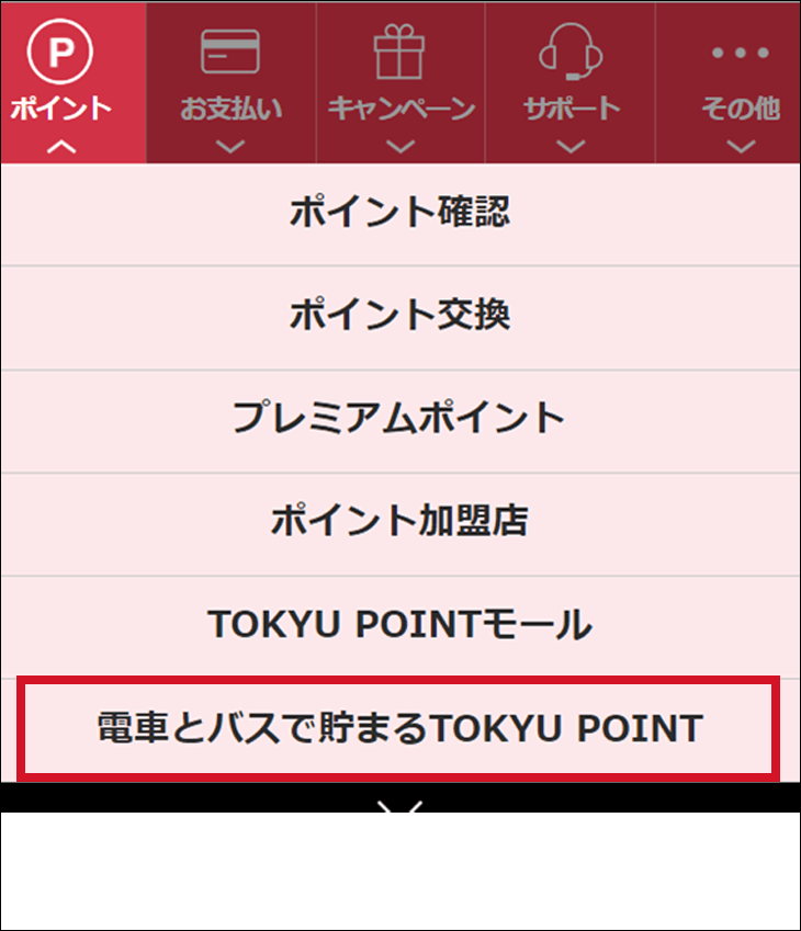 (2)ポイントメニュー一覧の「電車とバスで貯まるTOKYU POINT」をクリック