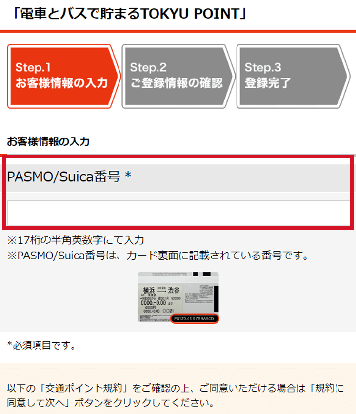 (3)PASMO番号を入力し「規約に同意して次へ」をクリック