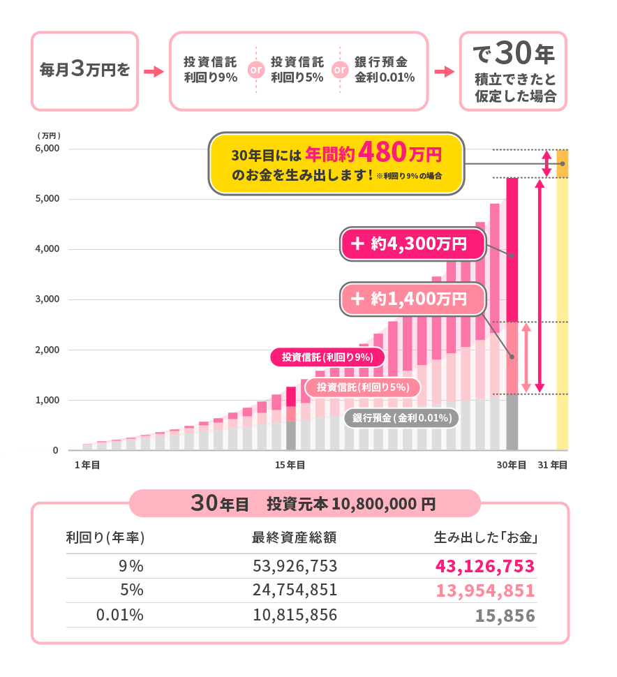 毎月3万円を30年つみたてした場合、どのようにお金が育つのか見てみましょう。